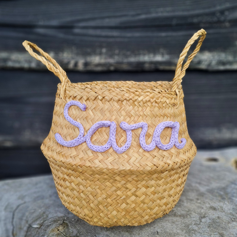 Een mooie en kleine buikmand, voorzien van een naam naar keuze. Een superleuk kraamcadeau of als decoratie op de kamer van je kindje.