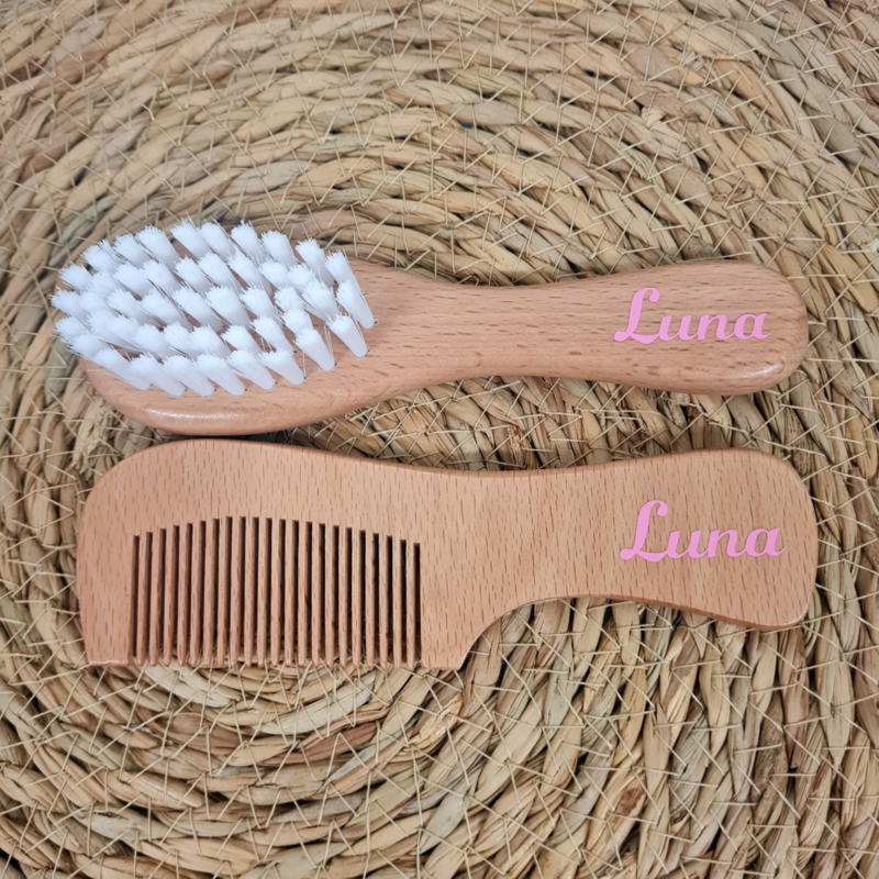 Deze haarset bestaat uit een houten baby borstel en kam met naam. Het setje wordt geleverd in een linnen zakje. Een leuke cadeauset om te geven als kraamcadeau, of voor je eigen kindje!